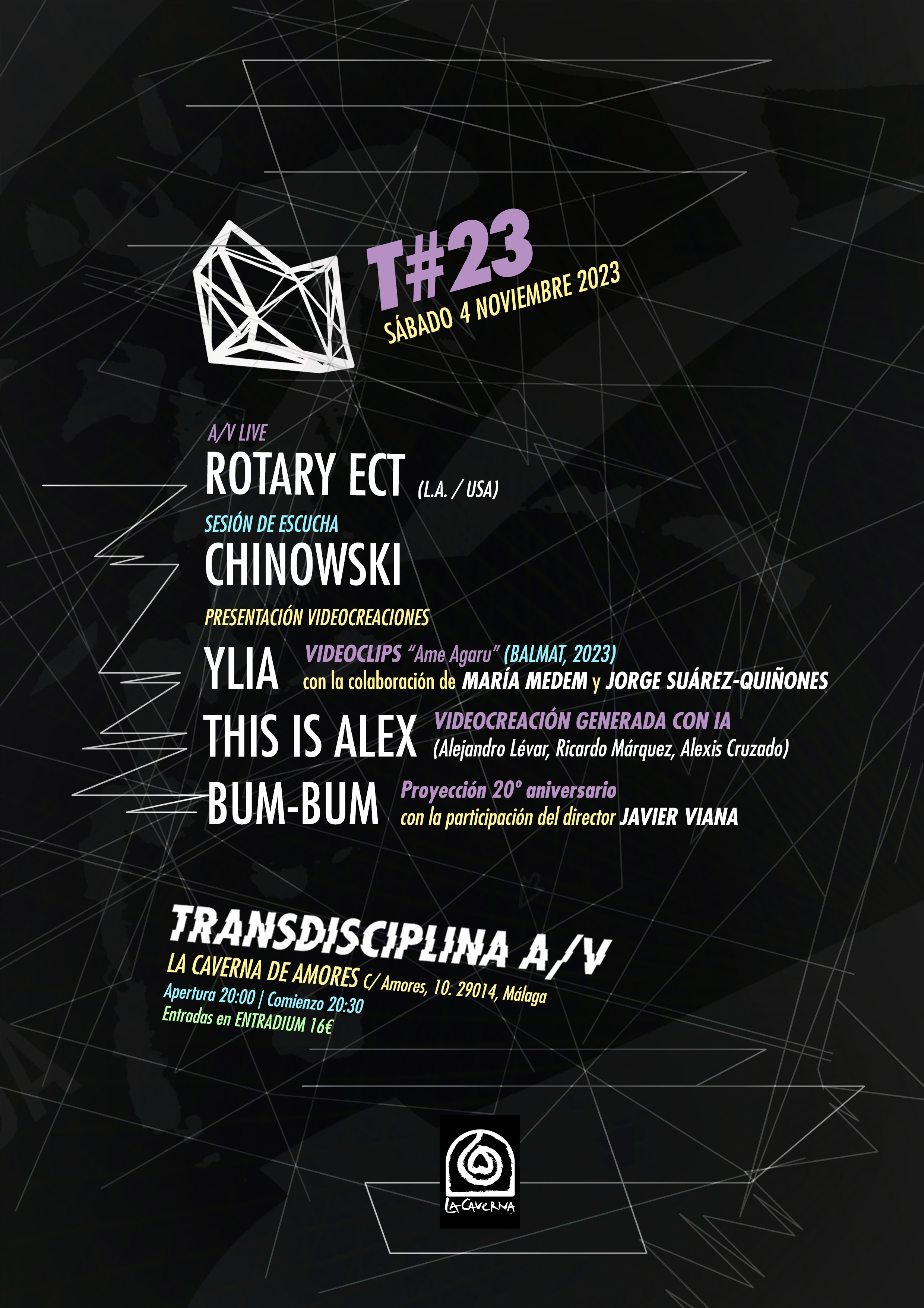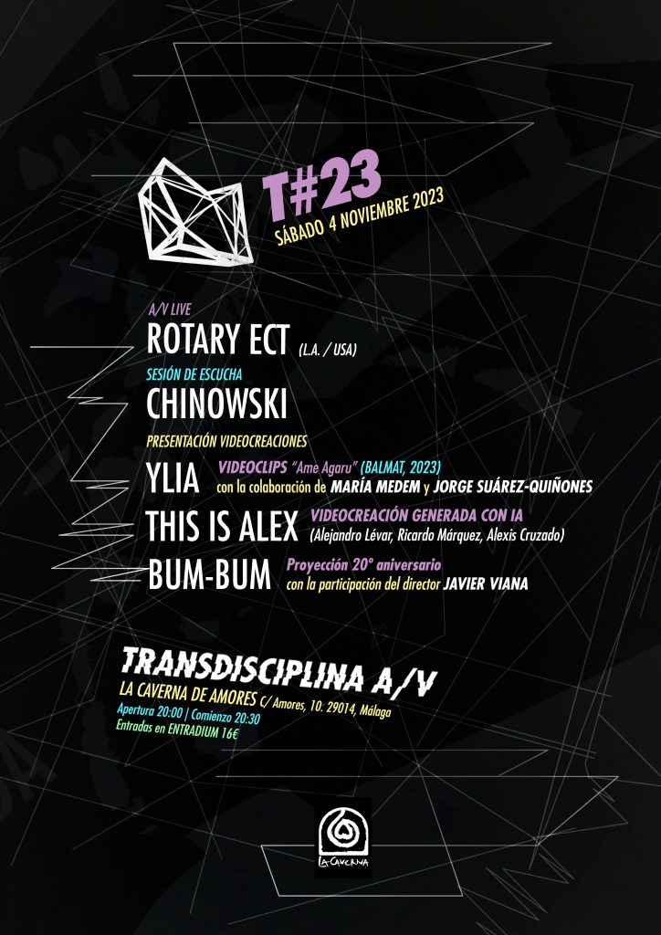 Celebramos nuestra edición T#23 volviendo al lugar que nos vio nacer hace más de 7 años, La Caverna de Amores. Lo hacemos con una programación muy especial en la línea que más nos gusta: ecléctica, multidisciplinar y 100% sonovisual.