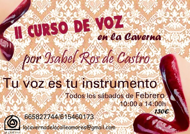 CURSO DE VOZ con Isabel Ros En Febrero regresa Isabel Ros para deleitarnos con su CURSO DE VOZ en la Caverna…los interesad@s… aún quedan plazas. Comparte esto: Haz clic para compartir en Facebook (Se abre en una ventana nueva) Facebook Haz clic para compartir en X (Se abre en una ventana nueva) X Me gusta Cargando... Comparte esto: Haz clic para compartir en Facebook (Se abre en una ventana nueva) Facebook Haz clic para compartir en X (Se abre en una ventana nueva) X Me gusta Cargando...